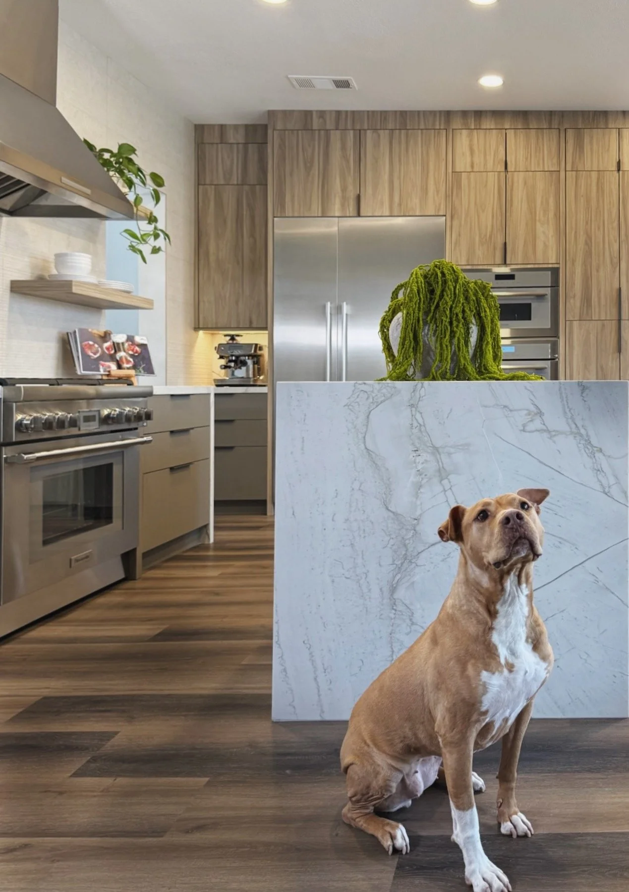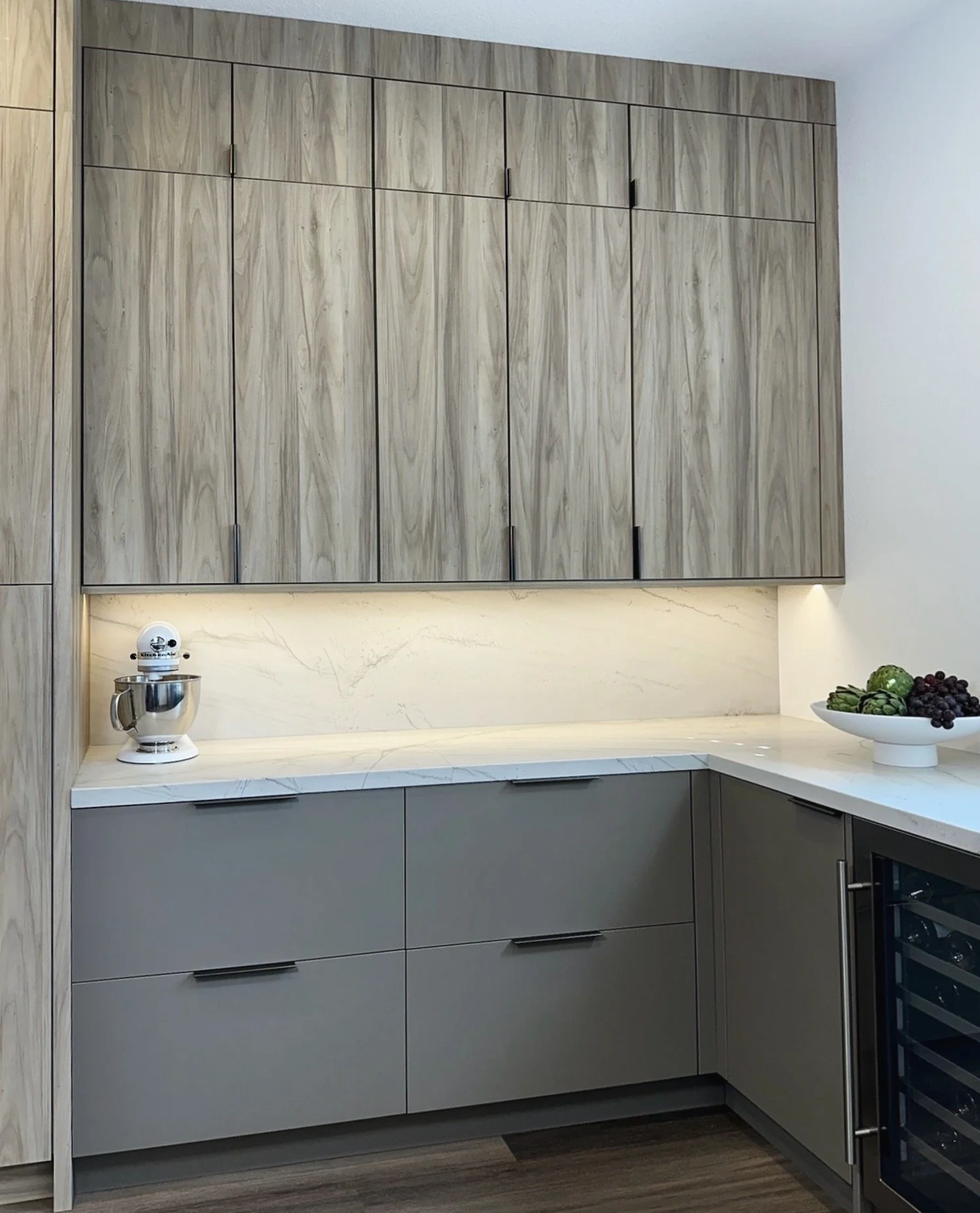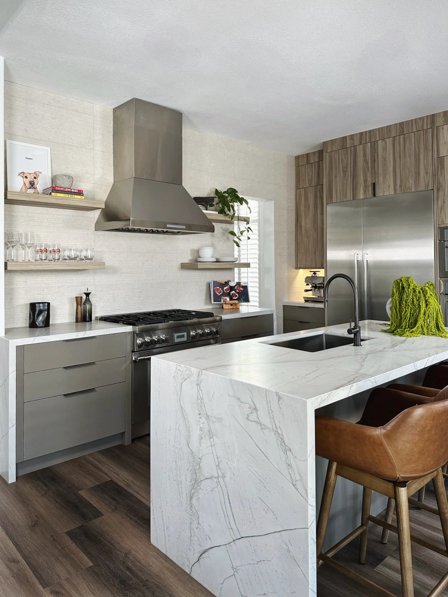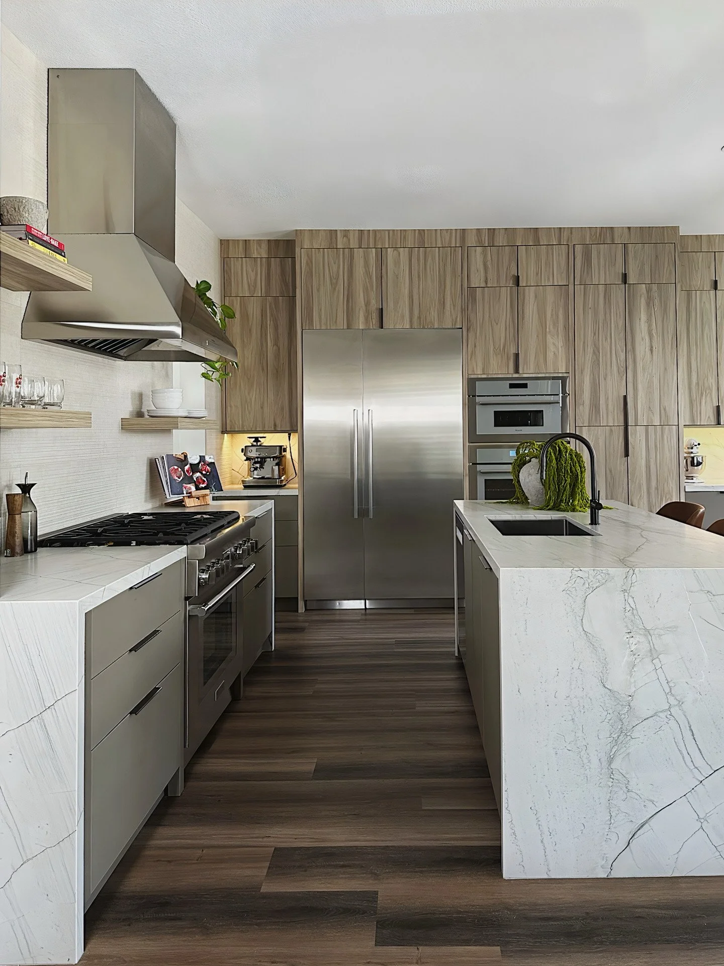 This modern kitchen remodel embodies bespoke materials, where simplicity meets tailored functionality. Flat-panel cabinetry in warm, textured woods creates a refined architectural backdrop, while the dramatic Mont Blanc stone waterfalls and anchors the space.